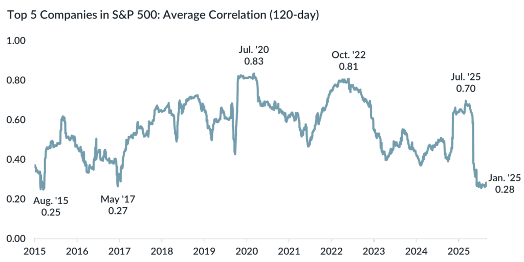 Even as media coverage of market concentration has intensified this past year, the issue has only become more pronounced. In the past six months alone, the top five weight has increased from 24.3% to 28.6%. Since the end of 2014, the weight of the top five has almost tripled from 10.9%.