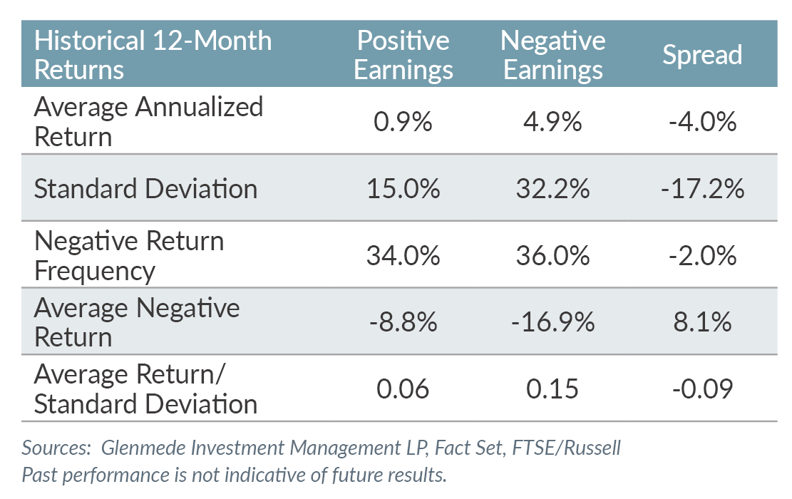 Investing in companies with positive earnings has been a successful strategy versus investing in companies with negative earnings. The chart in Exhibit 1 captures the longest available history for which we have usable data for the Russell 2000 Index. Not only have stocks with positive earnings provided a superior total return, but they also have done so with less risk than those stocks with negative earnings.